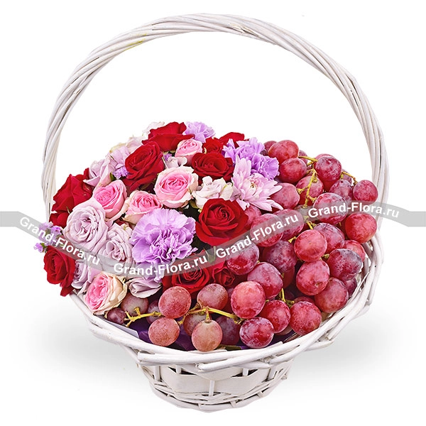 Стандартный: роза кустовая красная - 2 шт., роза кустовая сиреневая - 2 шт., гвоздика фиолетовая - 3 шт., хризантема кустовая фиолетовая - 2 шт., статица фиолетовая, оазис, виноград - 2 кг., корзина.