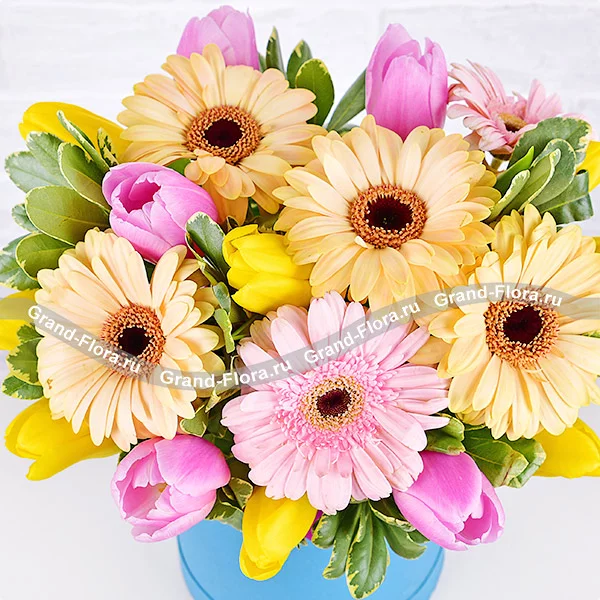 Стандартный: гербера желтая - 4 шт., гербера розовая - 2 шт., тюльпан желтый - 8 шт., тюльпан розовый - 5 шт., зелень, оазис, коробка.
