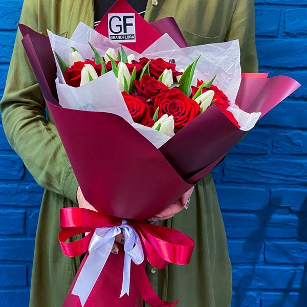 Выбрала этот букет из-за оригинального сочетания. Красные розы и белые тюльпаны, как снег среди роз. Вживую выглядит еще лучше. Рекомендую этот букет!