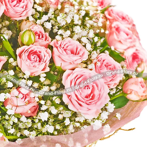 Нежный аромат цветов деликатен и ненавязчив, а сам букет может достойно украсить дом или офис. Этот букет для тех, кто любит делать подарки. Просто так. Для тех, кому важно хорошее настроение близких. Розовый цвет расскажет о Вашем веселом нраве и искренней симпатии, и каждый раз, вдыхая чудесный аромат, о Вас  будут вспоминать с улыбкой и нежностью.